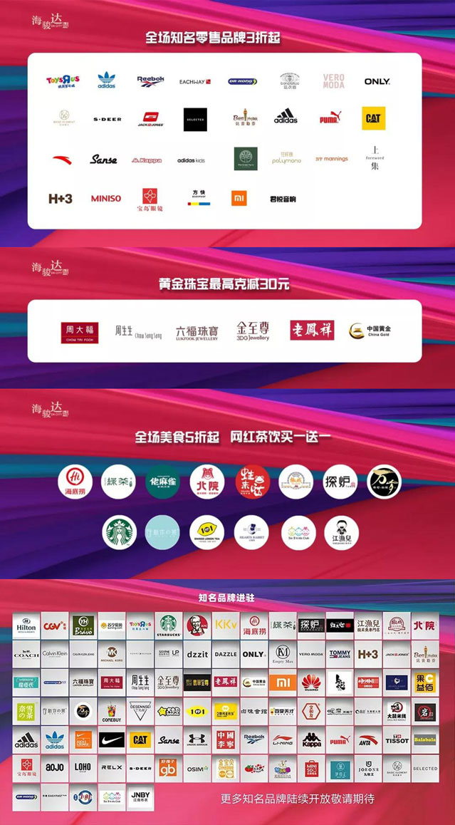 除了各種活動外,海駿達城在開放當天還聯合各大品牌商家實行多重優惠重磅輸出,鉅惠全城。轉發有禮,會員專享積分,零售品牌全場最低3折,餐飲品牌全場最低5折,黃金最高克減30元等。其中,玩具反斗城滿200送100、滿100減50;VERO MODA全場5折起;Adidas originals全場8折;金至尊彩金鉆石滿1000立減300;海底撈送送菜卡;椒戲酸菜魚5折……吃喝玩樂購,應有盡有,一應俱全,瞬間滿足。